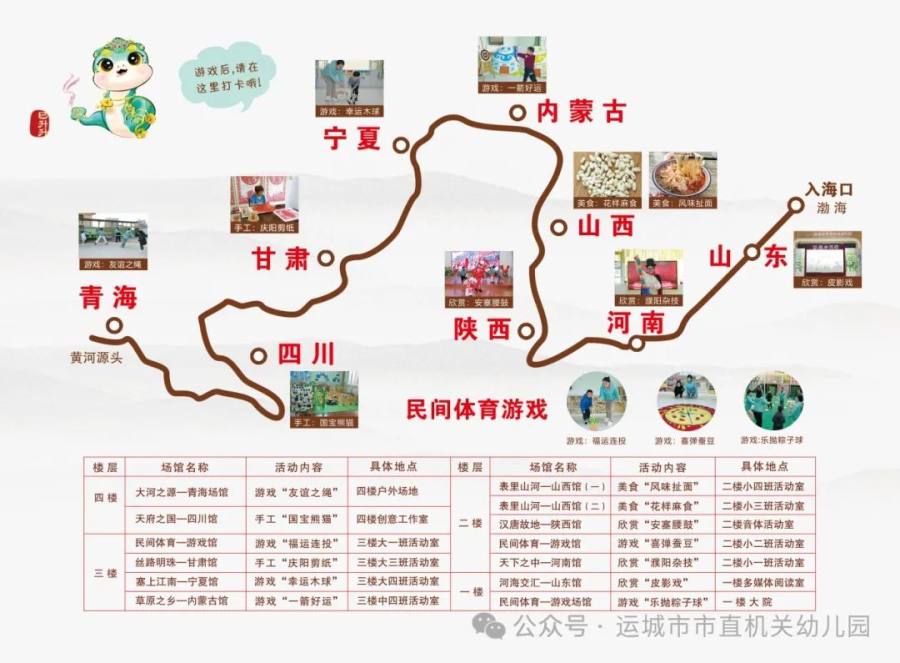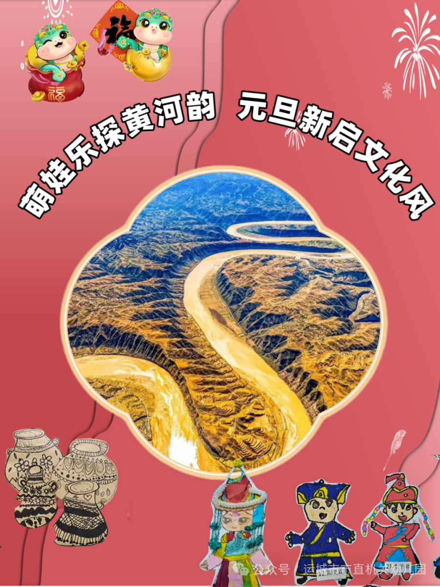 黄河,是中华民族的母亲河,黄河文化是中华文明的重要组成部分。为使黄河文化遗产在新时代焕发新活力、绽放新光彩,市直机关幼儿园创新工作思路,把黄河文化遗产作为培养时代新人的宝贵历史资源,在前期进行黄河流域运城段文化探究的基础上,继续延伸扩大,以黄河沿线九省为线索,以“黄河情·中国梦”文化主题展和"黄河之韵”非遗欣赏、“黄河之艺”手工制作、“黄河之味”美食品尝、“黄河之趣”游戏体验为载体,在新年来临之际,开展“萌娃乐探黄河韵 元旦新启文化风”庆元旦开放活动,奏响市直机关幼儿园老师、孩子和家长了解黄河文化、传承黄河文化的“协奏曲”。