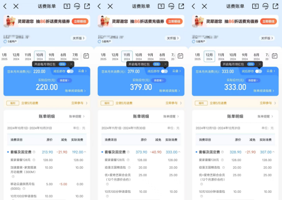 来自陕西的吴晗(化名)告诉新识研究所,自己的父亲在2024年2月办理了220元/月的套餐合约机,三年最终费用7920元,而手机价值仅1000多元,10月份向工信部投诉一直无人处理,且在11月又增加了100多元的套餐,一个退休老人每月花费高达300多块钱。
