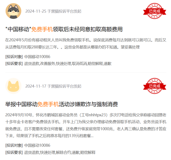这种情况并非个例,在黑猫投诉平台输入关键词“免费手机”后,出现200多条相关投诉,涉及运营商包括移动、电信等。
