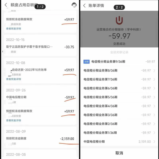 开通橙分期服务意味着用户需要遵守一定的合约期限,在此期间必须确保手机号码无欠费情况,否则将影响当月的还款。根据姚远提供的“额度占用明细”记录,其父亲的账户每个月都会有一笔59.97元的中国电信橙分期款项到账并自动扣除。姚远的父亲表示,自己完全不知情关于这一橙分期的存在。