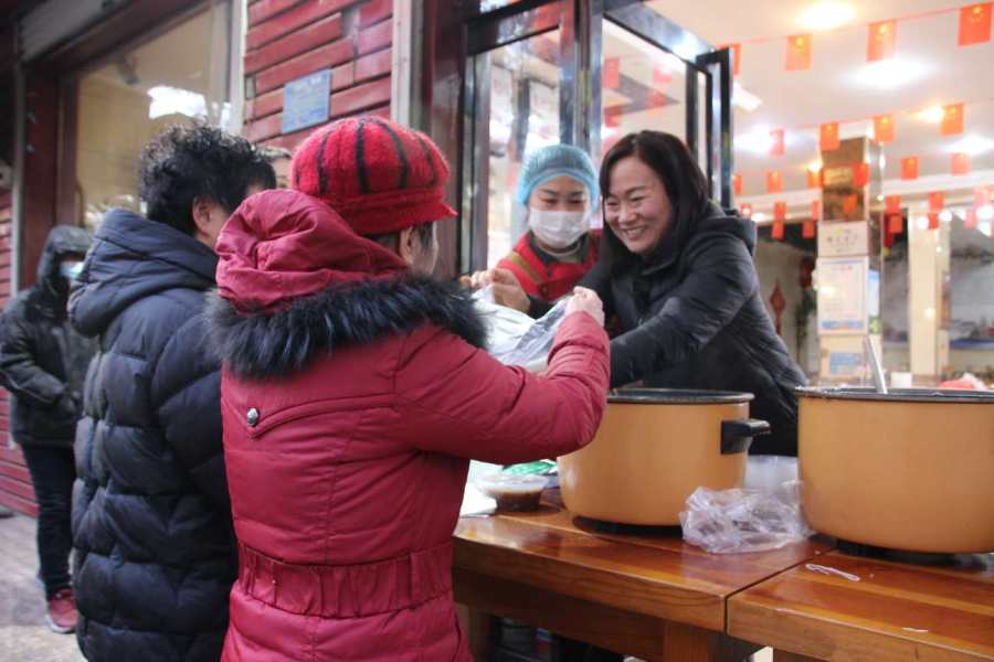 在喜圆酒店门口,该店不仅为市民精心准备了爱心八宝粥,该店负责人张晓丽表示:“腊八节喝腊八粥是传统习俗,我们今天准备了800多份八宝粥,还有鸡蛋、馒头和菜品,只为在温暖登封中尽自己的微薄之力”。