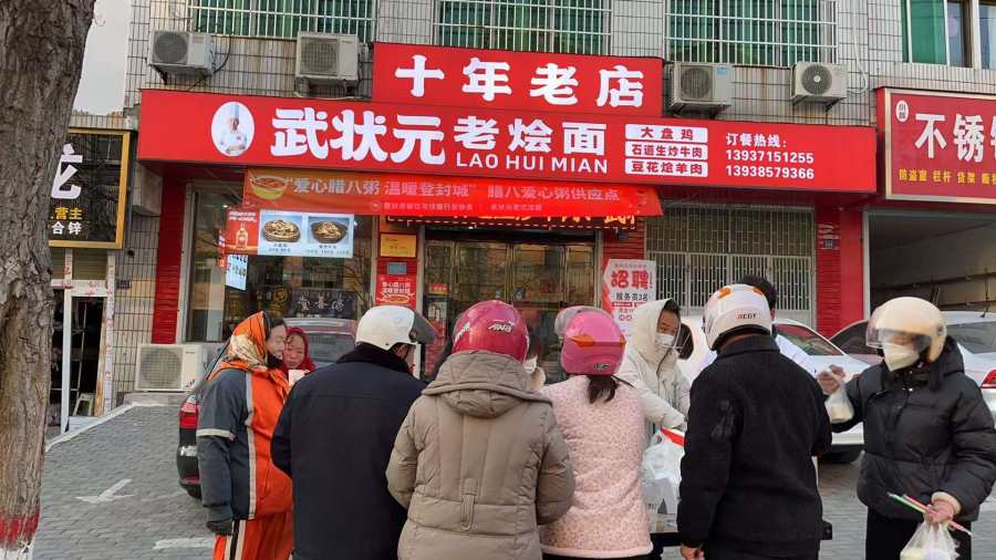 在郑州武记餐饮民俗菜门口,记者看到郑州武记餐饮旗下店门口排起长队,粥香四溢,登封市民依次免费排队领取腊八粥。