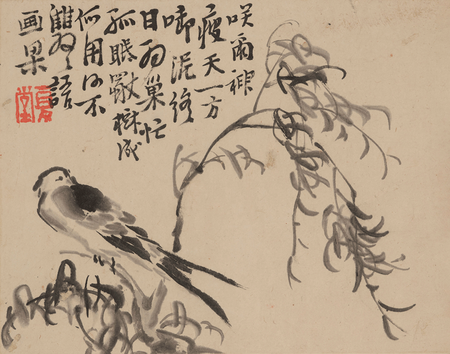 题识:笑尔神疲天一方,衔泥终日为巢忙。孤眠独树成何用,何不双双语画梁。