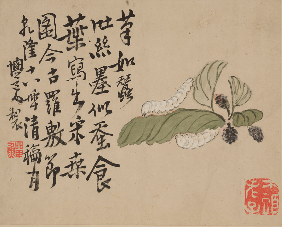 题识:笔如蚕吐丝,墨似蚕食叶。写出采桑图,今古罗敷节。乾隆十八年清和月懊道人制。