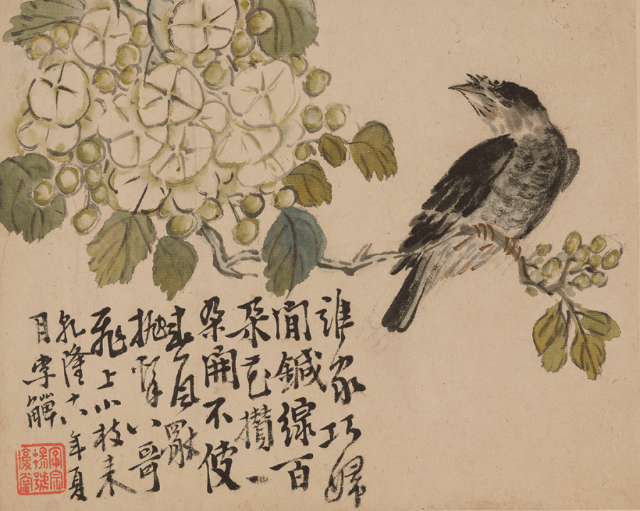 题识:谁家巧妇闲针线,百朵花攒一朵开。不使春风独抛系,八哥飞上小枝来。乾隆十八年夏月,李鱓。