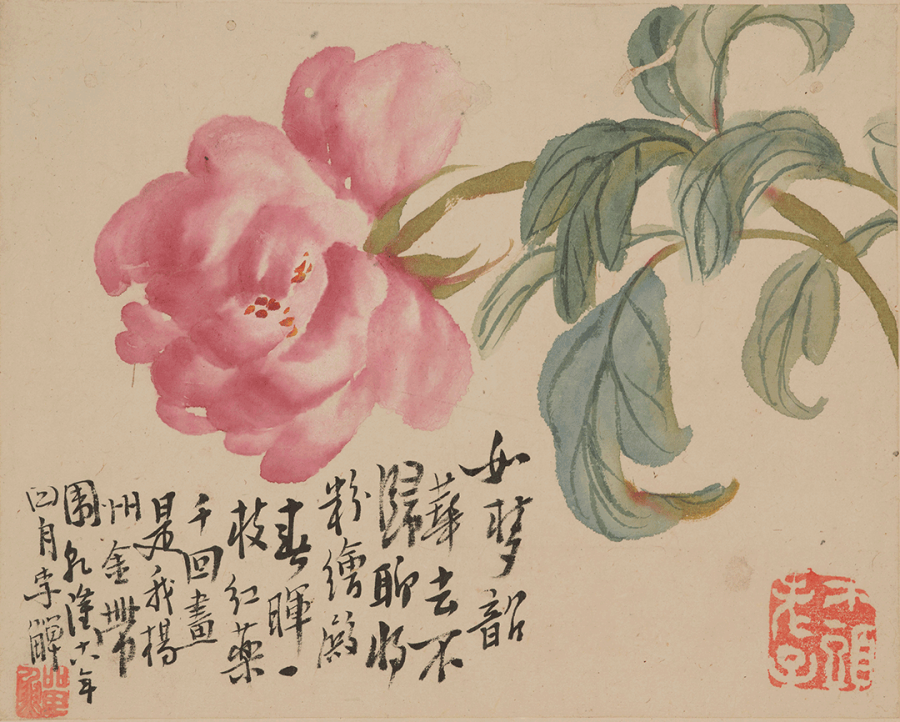 题识:如梦韶华去不归,聊将粉绘殿春晖。一枝红药千回画,是我扬州金带围。乾隆十八年四月,李鱓。