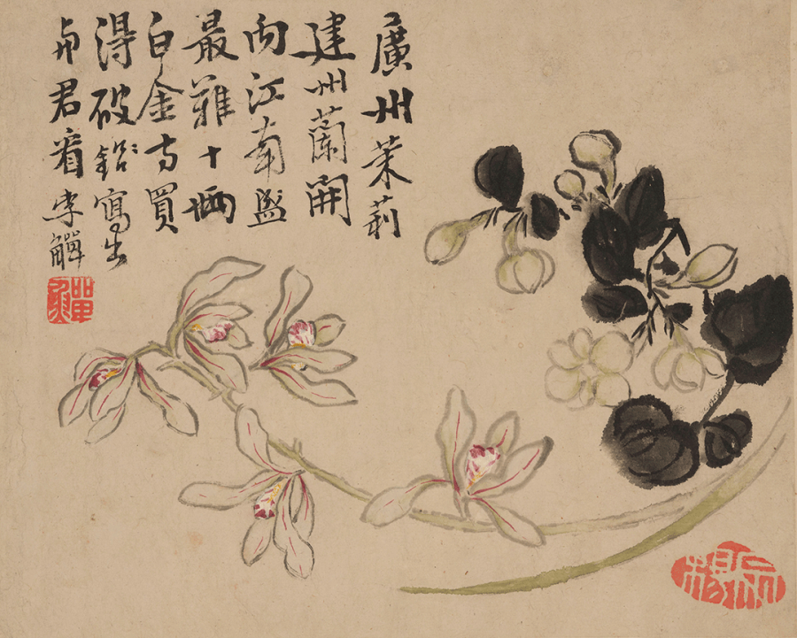 题识:广州茉莉建州兰,开向江南盛最难。十两白金方买得,破铅写出与君看。李鱓。