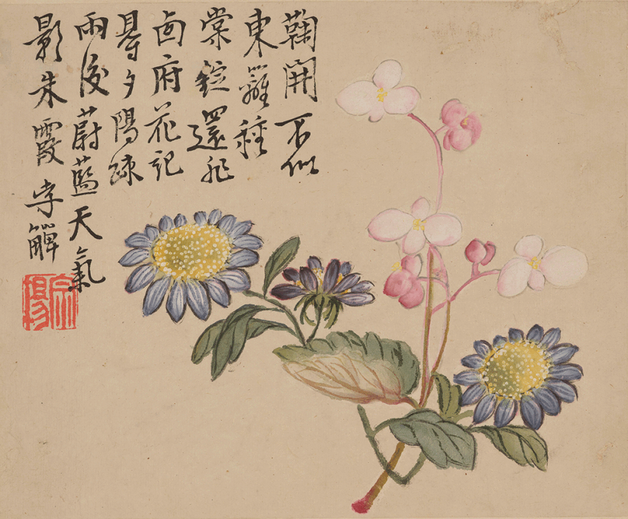 题识:鞠开不似东篱种,棠绽还非西府花。记得夕阳疏雨后,蔚蓝天气影朱霞。李鱓。