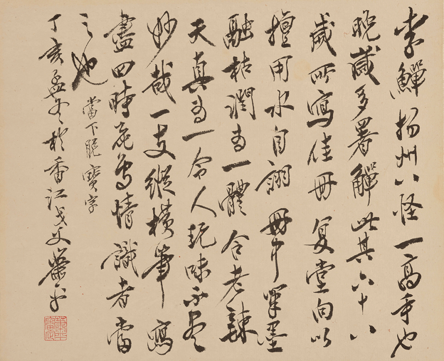 自述:颜色费事,墨笔劳神,颜色皮毛,墨笔筋骨,颜色不到处可以添补遮盖,墨笔则不假妆饰,譬之美人,粗服乱头皆好。八大山人长于笔而墨不及石涛,清湘大涤子用墨最佳,笔次之。笔与墨合作生动,妙在用水。余长于用水而用墨,用笔又不及二公甚矣。