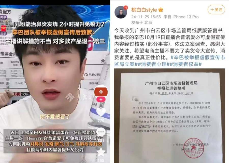曾因“大闸蟹”开撕小杨哥的辛巴,也再次陷入带货翻车风波,因与徒弟蛋蛋在直播间带货的一款“HomePro合普诺爱毕可免疫球乳铁蛋白”调制乳粉涉嫌虚假宣传,被博主实名举报,最终被相关部门立案调查。