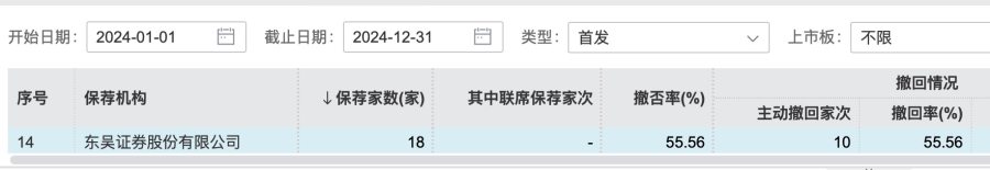 据Wind,2024年,东吴证券共有18家保荐项目,主动撤回10家,撤否率达到55.56%。
