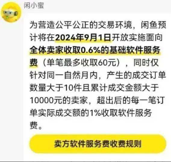 接下来2024年8月,闲鱼又宣布了一项重大变革:自9月1日起,将面向全体卖家收取0.6%的基础软件服务费,单笔最高不超过60元。
