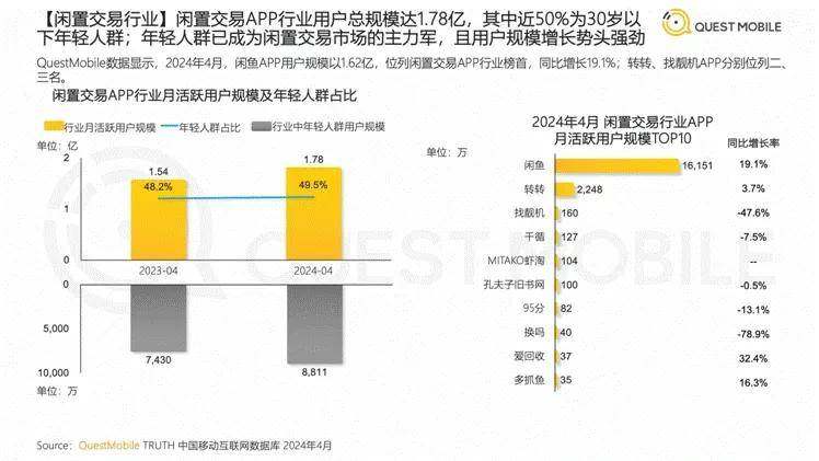 QuestMobile的报告也佐证,2024年4月,闲鱼MAU(月活)高达1.62亿,同比增长19.1%,霸榜闲置行业魁首,且遥遥领先转转、找靓机等其他同业。