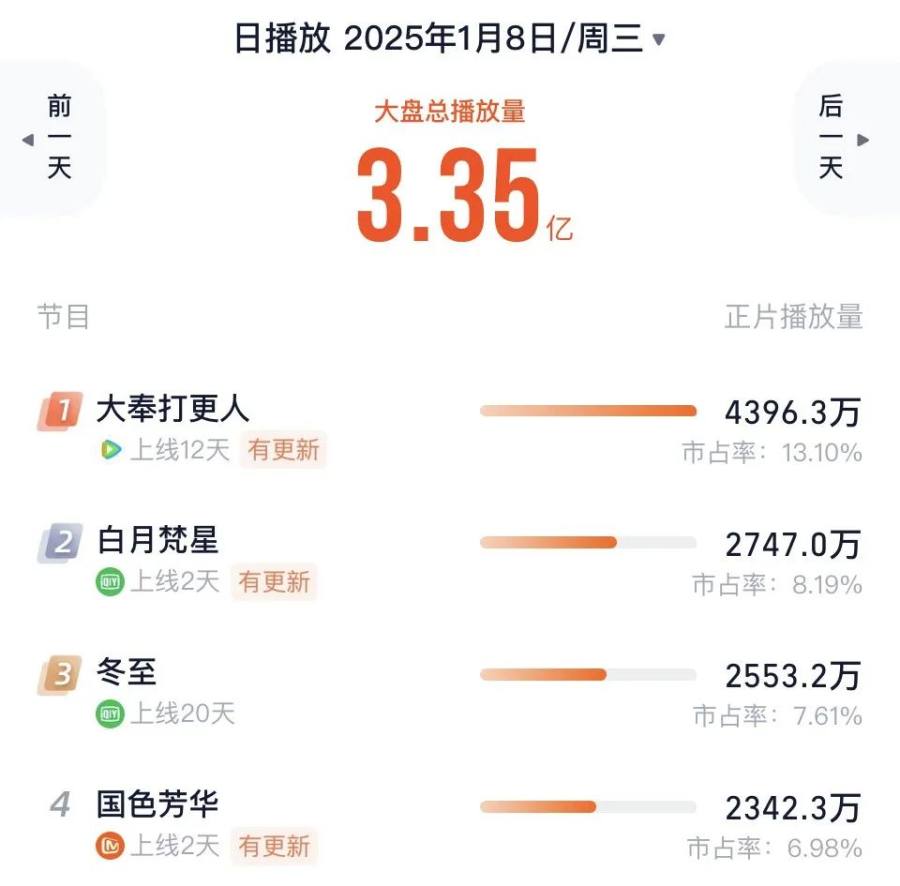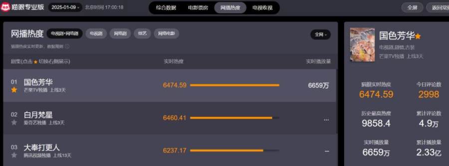 截至1月9日17:00,猫眼专业版数据显示,《国色芳华》实时热度仍居榜首,全网累计播放量已超2.3亿。