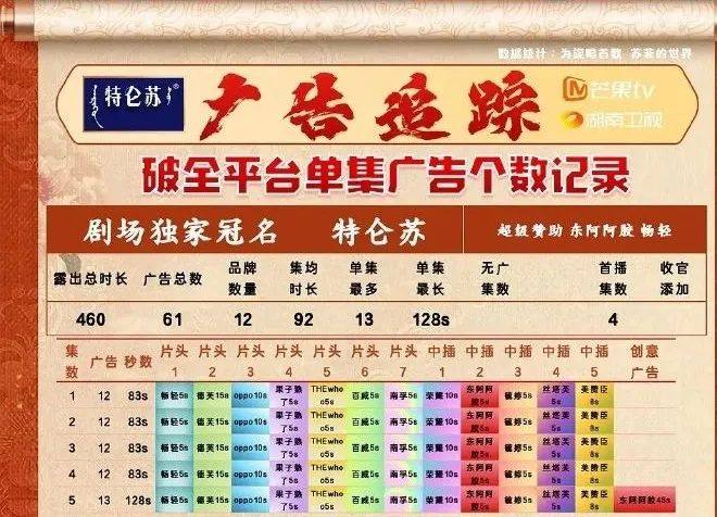 热情的除了观众,还有剧集的赞助商。除了总冠名“特仑苏”,芒果TV还为《国色芳华》开辟出了超级赞助的席位,分别由东阿阿胶和畅轻赞助。此外,据统计,《国色芳华》开播当晚放出的4集中,每集广告高达12个;第5-6集的广告增至13个。