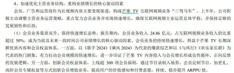 据芒果超媒2024年中报数据,2024上半年,芒果TV的会员业务、广告业务和运营商业务收入分别为24.86亿元、17.21亿元和7.5亿元,占比分别为50.1%、34.7%和15.1%;而在2021年,芒果TV的会员营收还在三成左右。