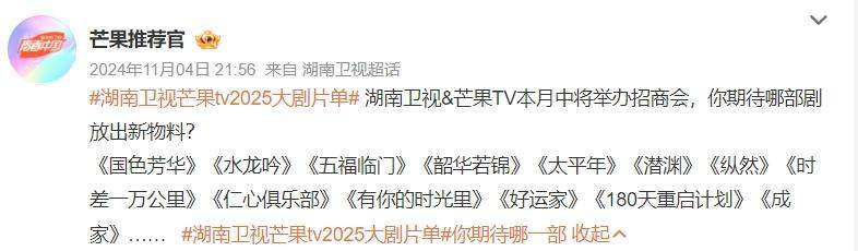在2024年11月的招商会上,芒果TV也不再强调剧场化,而是加大了头部剧的供应。招商会上,芒果TV围绕“女性力量”“青春耀眼”“烟火沸腾”“志气锋芒”四大赛道,一口气放出了近百部待播剧集。片单里,除了《国色芳华》,头部大剧还有根据藤萍小说改编的《水龙吟》,广电重点历史剧《太平年》,根据贾平凹小说改编的同名剧《秦腔》等等。