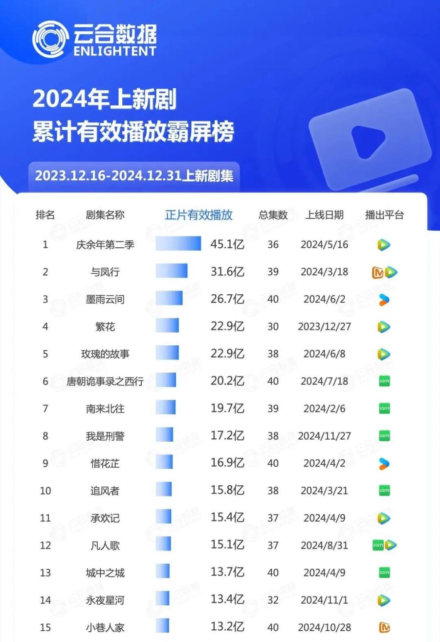 相比来看,“优爱腾芒”四大长视频平台里,芒果TV作为“综艺特长生”,剧集供应的数量一直垫底。2024年,芒果TV共上新32部国产剧,爱奇艺和优酷分别上新国产剧集166部和95部。在云合数据公布的2024年上新剧有效播放霸屏榜单中,芒果TV也仅有一部独播剧《小巷人家》上榜。