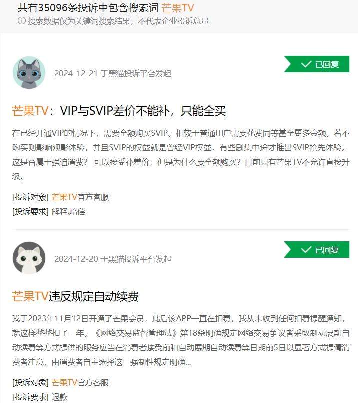 尽管如此,还是有不少用户吐槽其“诱导消费”“吃相难看”。有消费者表示,自己点进芒果TV“抽奖会员”的角标广告,结果发现是话费充值。“黑猫投诉”平台上,有超过3.5万条投诉中包含搜索词“芒果TV”,其中有不少用户的投诉内容都质疑芒果TV会员存在未提前告知自动续费的情况。
