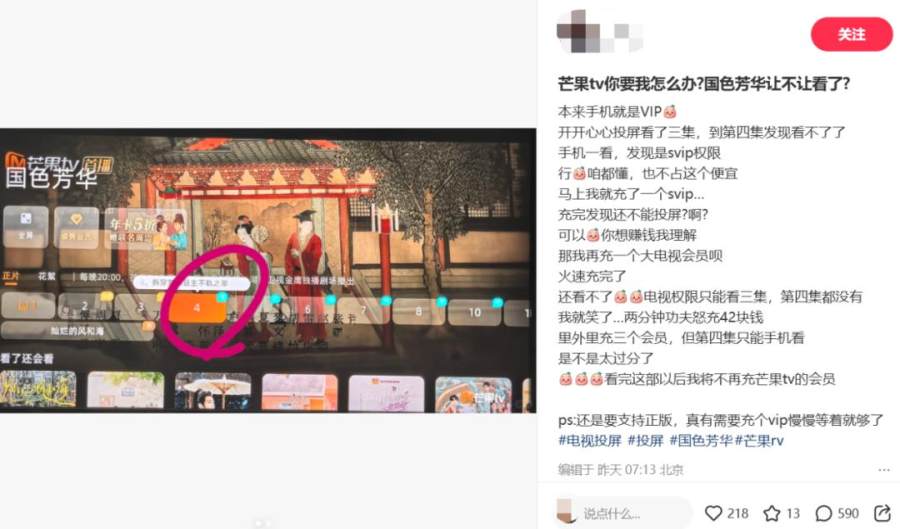 如今正热播的《国色芳华》,部分集数也开放了SVIP提前看的权益。然而,陆续有用户提到,为了看剧买SVIP后却发现无法投屏,买完大电视会员后却发现在电视端无法观看最新集。由此看来,如何在推广付费会员套餐的同时平衡好用户体验,也是平台亟需解决的问题。