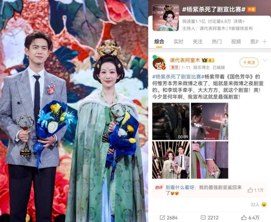 典型例如杨紫,微博之夜当晚,她高还原了主演剧集《国色芳华》中的服饰和妆造,以角色“何惟芳”的形象来到现场,“杨紫杀死了剧宣比赛”直接登上热搜;还有徐克、肖战带领的射雕剧组,舞台上,肖战向现场和荧幕前的观众卖起了安利,也带动《射雕英雄传:侠之大者》的多个话题登上热搜。