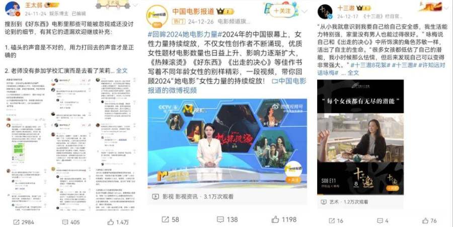 此外,大量带有强创作者表达、体现社会情绪和现实思潮的优质作品,也在热搜榜上发酵出了延展内容。典型例如《热辣滚烫》《出走的决心》《好东西》等电影上映时,关于主创的深度采访实现大规模出圈,优质女性创作者的自我表达在舆论场激起了大量同道中人的热情安利,推动票房节节攀升。