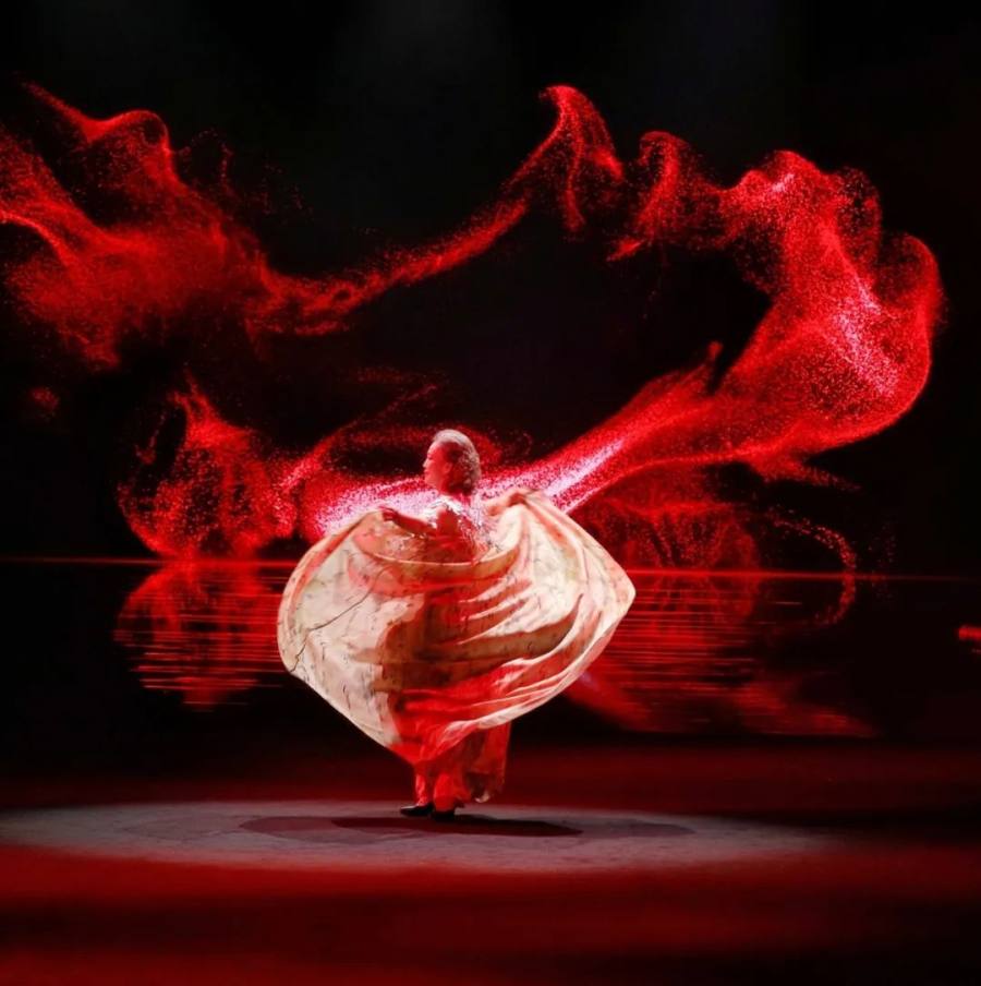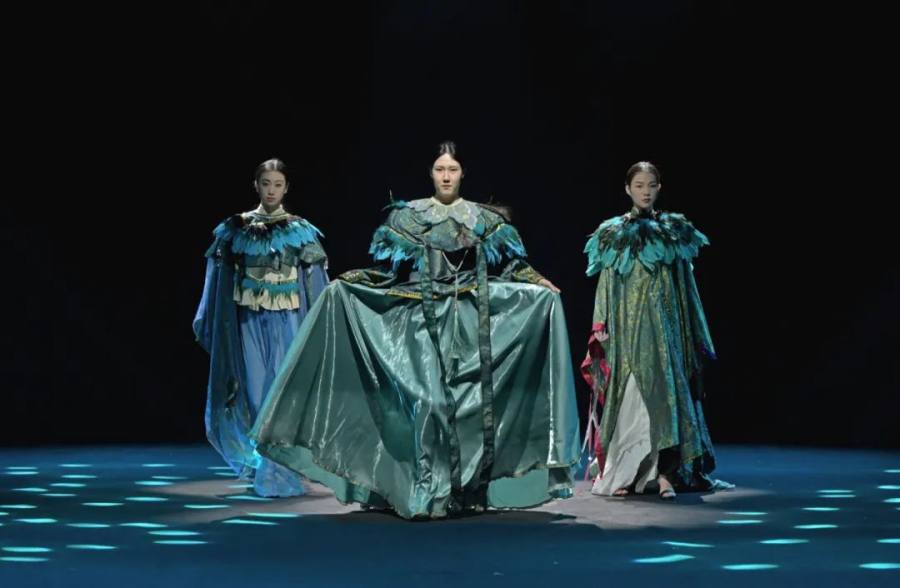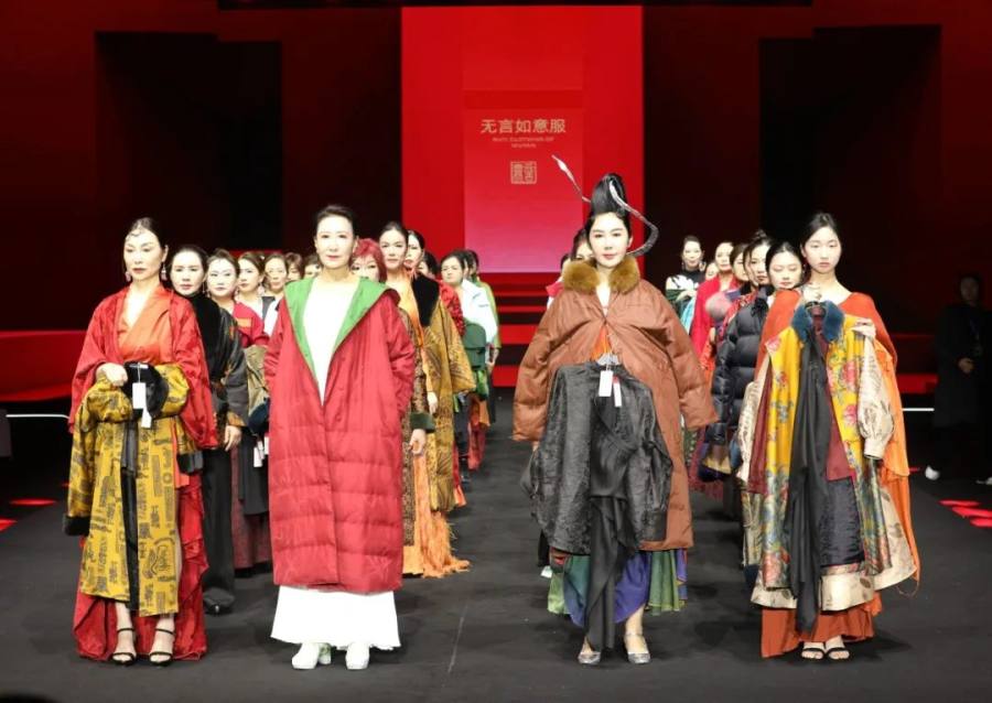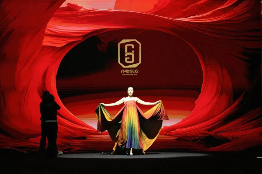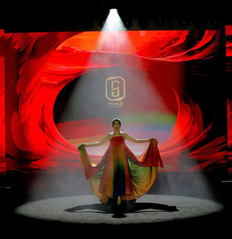 “齐物东方・觉色” 这场跨年盛典的 “压轴” 大秀,分为两大系列,专门从东方陆上丝路文化和海上丝路文化的 “故事宝库” 里挑典故,创新推出的现代新中式服饰,既有传统的韵味,又贴合当代人的审美,糅合中国哲学和东方美学 ,完美呈现出齐物东方的 “中国美”。“无言” 如意年服专注高定 20 年,非遗香云纱当 “联结纽带”,推出一堆超有中国传统美学范儿的产品。这次以年服为主,明艳、华贵的吉福马甲、上衣、风衣,个个都像带着 “吉祥如意、幸福美满” 的光环,闪亮众人。