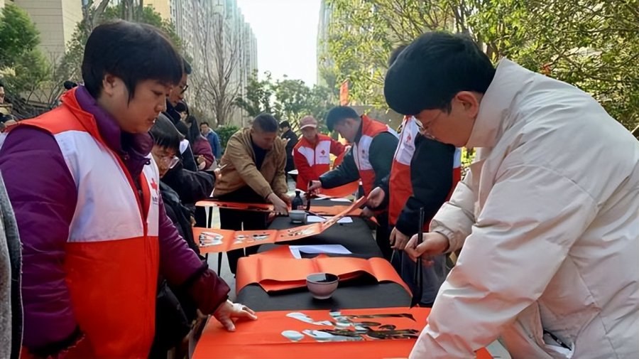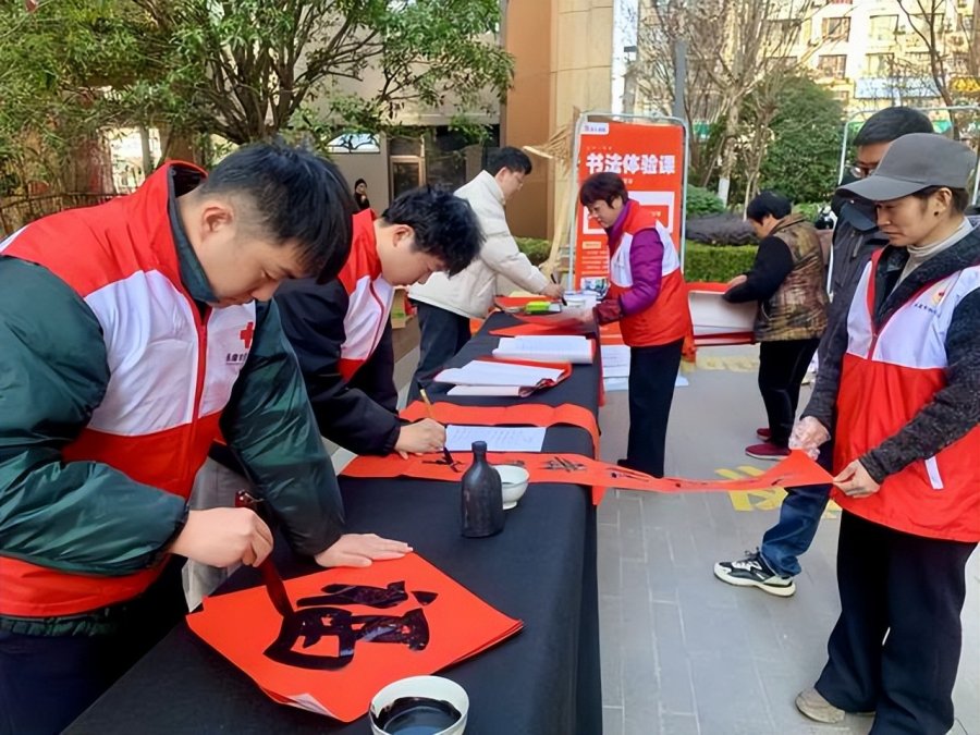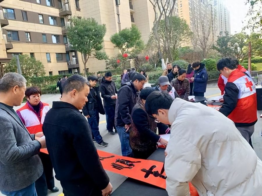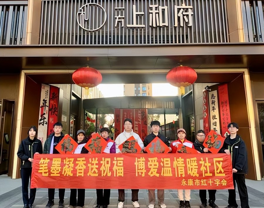 在春节即将到来之际,为营造喜庆祥和的节日氛围,弘扬“人道、博爱、奉献”的红十字精神,1月19日,永康市红十字会携手兴业银行、同人书院、万科物业等单位在一方上和府小区共同开展“笔墨凝香送祝福 博爱温情暖社区”送春联·送祝福志愿服务活动,将“文化年货”送到小区居民家中。