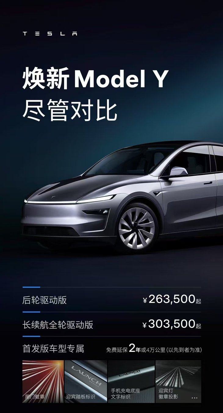 1月10日,特斯拉中国官网发布了焕新版Model Y,提供两个版本可供选择:后轮驱动版售价为26.35万元、长续航全轮驱动版为30.35万元。作为全球最大汽车市场,中国是Model Y焕新版全球首发地,此外,特斯拉还推出了首发版车型,在车尾、车门等位置设置了独特标识。