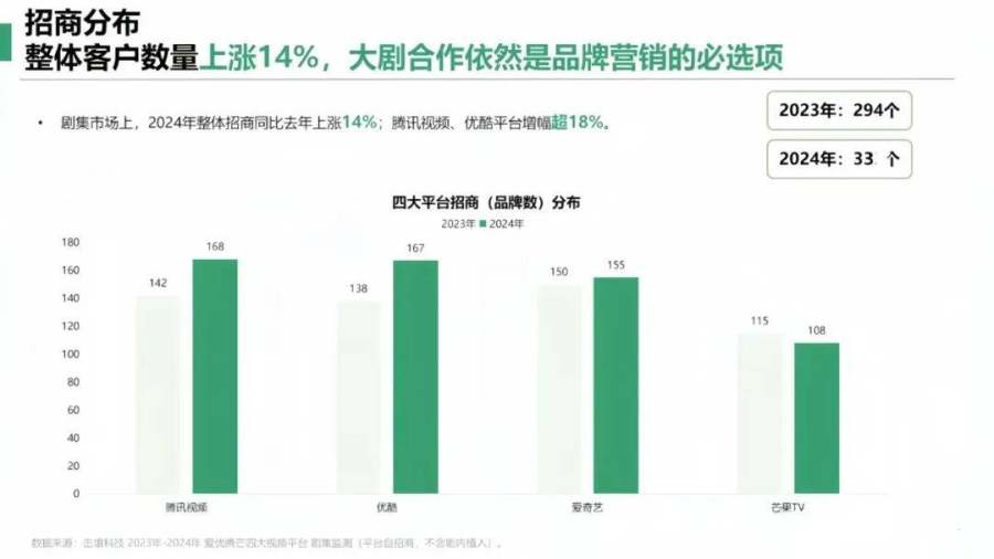 内容质量和招商数量同向而行,击壤报告披露,2024年大剧招商同比2023年上涨14%,其中,腾讯视频增幅超18%。