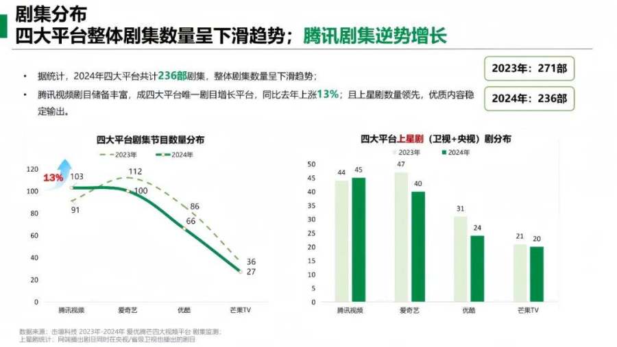 腾讯视频走势则恰好相反。击壤报告披露,2024年,四大平台共计236部剧集,呈现整体下降趋势,腾讯视频成唯一剧目增长平台,同比上涨13%。
