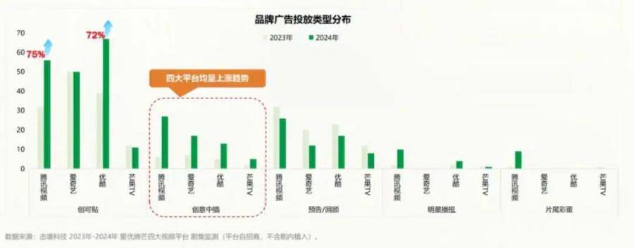 如今,大剧营销已经走向“Next level”,不再限于单一的剧集冠名、前后贴片等硬广模式,还涌现了创意中插、压屏条、弹幕提示、精彩预告、前情提要、弹幕互动、主角金句等多元广告形式,深入到“态度营销”、“价值共振”、“情绪共鸣”的新阶段。据前述击壤报告披露,2024年,腾讯视频创意广告资源客户数量再登榜首。
