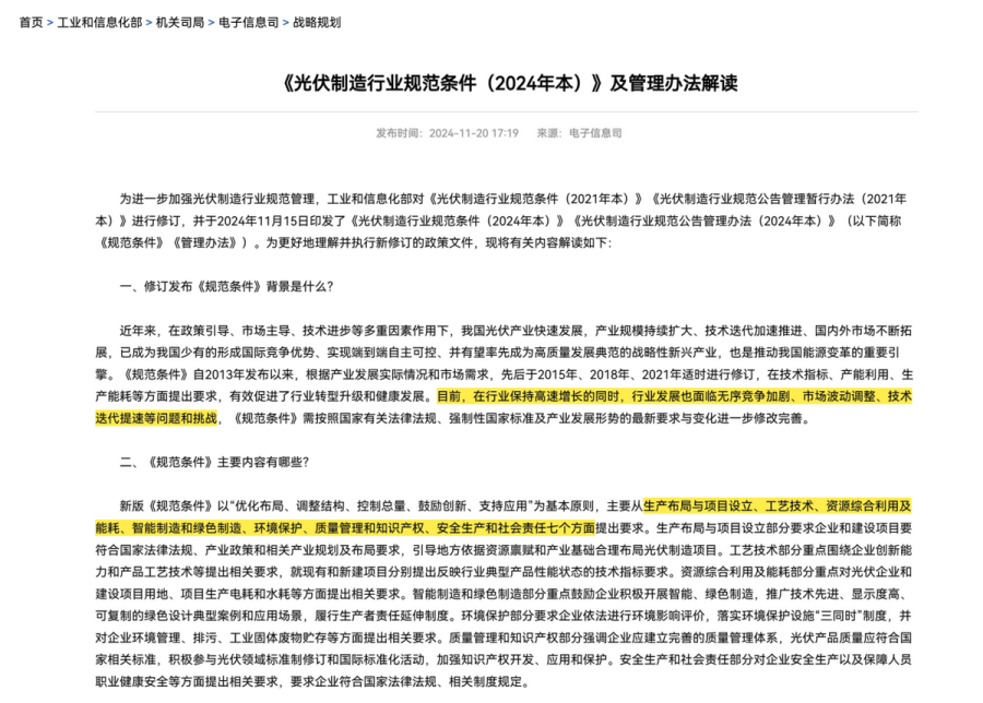 2024年11月20日,工信部修订发布新版《光伏制造行业规范条件》和《光伏制造行业规范公告管理暂行办法》,强化了对光伏投资项目的最低资本金比例要求,大幅提高了新建电池项目门槛,并要求加强质量管理和知识产权保护。隆基董事长钟宝申也在光伏年度大会上提出,光伏行业的关键问题是经营主体过多,同时要提高技术标准和加强知产保护力度。