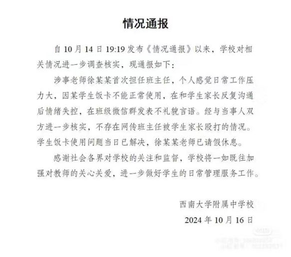 该中学于10月16日再次发布通报否认网传老师被殴打情节,表示涉事老师徐某某首次担任班主任,个人感觉日常工作压力大,因某学生饭卡不能正常使用,在和学生家长反复沟通后情绪失控,在班级微信群发表不礼貌言语。先前通报结果中暂停涉事老师的工作的处理结果被更改为涉事老师已请假休息。这不仅是一起简单的教育失范行为,而是家校冲突、教师地位困境乃至教育生态失衡的集中体现。