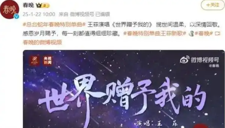 1月22日,@春晚 官方微博发文称,王菲将在春晚演唱特别单曲《世界赠予我的》。春晚官博写到:“王菲演唱《世界赠予我的》 揽世间温柔,以深情回敬。感恩岁月赐予,每一刻都值得细细珍藏。”据悉,这首歌由袁晶作词,曹正杰谱曲,两人都是来自湖北的音乐人,曾多次合作创作歌曲。而这首歌的监制则是王菲的老朋友常石磊。关于这首歌,相关人士透露,歌曲的意义在于:“当我们用温柔眼眸凝望世界,世界也会真挚地回应生命中的所有追问,并馈赠我们一切温暖与美好。”此前,王菲曾4次登上春晚,演唱的歌曲分别是1998年的《相约九八》、2010年的《传奇》、2012年的《因为爱情》以及2018年的《岁月》,几乎每首歌都成为传唱不衰的经典。