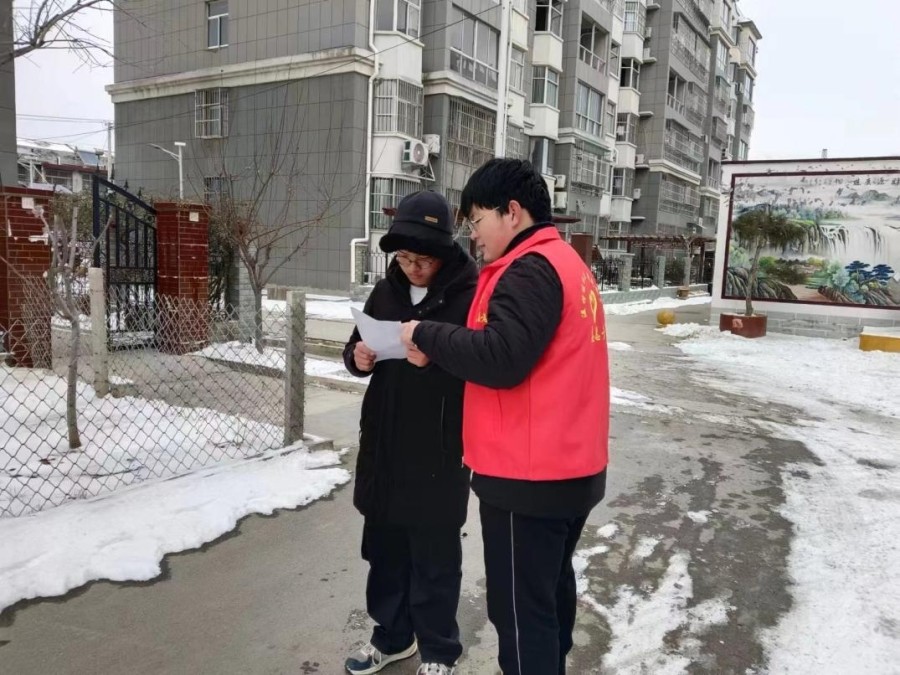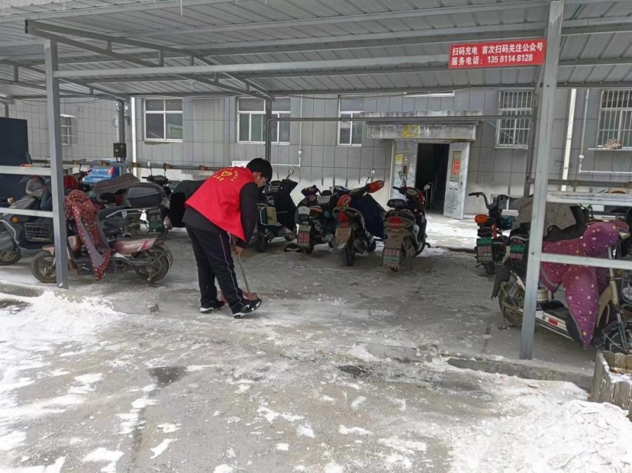 在排查过程中,实践队队员发现社区电动车棚出口处堆积了大量积雪,居民出行时极易滑倒,存在较大的安全隐患。队员们立即行动起来,找来扫帚等工具,齐心协力清扫车棚出口的积雪,为居民开辟出一条安全通道,有力保障了居民的出行安全和生命财产安全。
