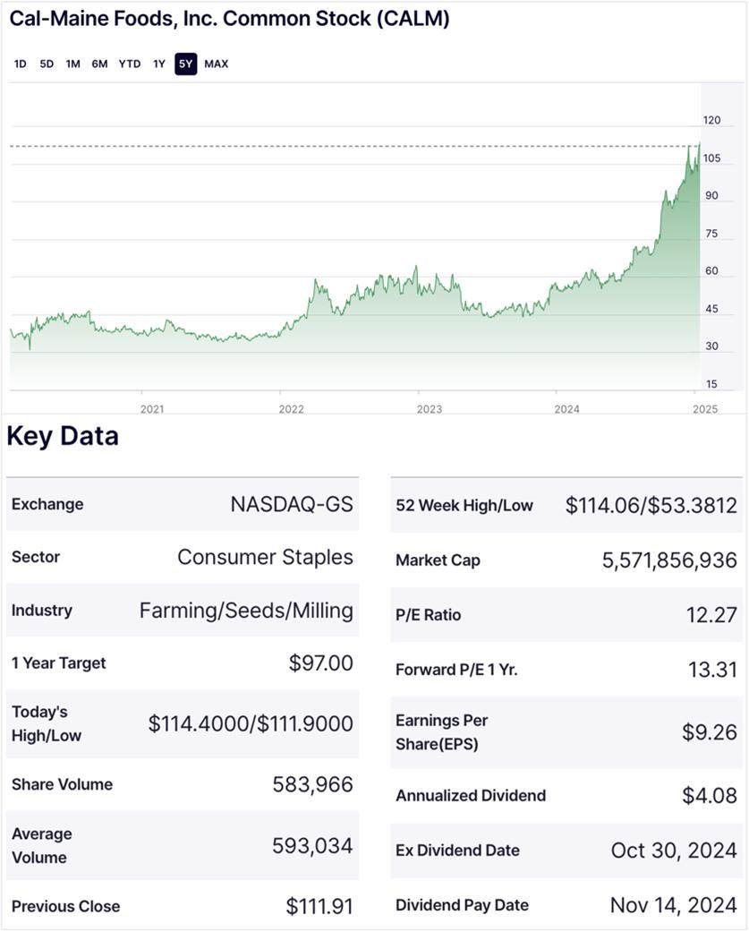 Cal-Maine Foods(CALM),一家市值55.7亿美元的鸡蛋产销为核心业务的上市公司,不仅业务单一——只卖鸡蛋的上市公司,其股价在2024美国禽流感爆发的情况下,仍然突飞猛进,最近一年内股价上涨了113%。
