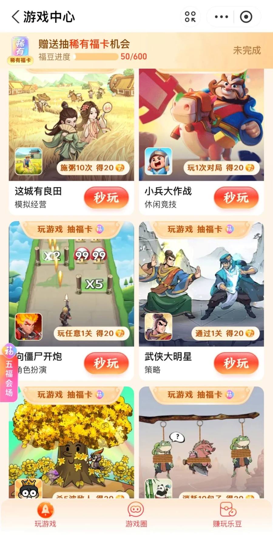 值得一提的是,今年集福卡活动最重要的应该是小游戏。在集五福的11个活动里面,“玩一玩”和“看视频”、“碰一下”、“扫一扫”等等一样,作为主要板块存在。打开“玩一玩”,用户就进入支付宝的游戏中心,共有29款小游戏参与集五福的活动,每款小游戏专门设置了集五福的任务,只要完成任务就有机会抽福卡。