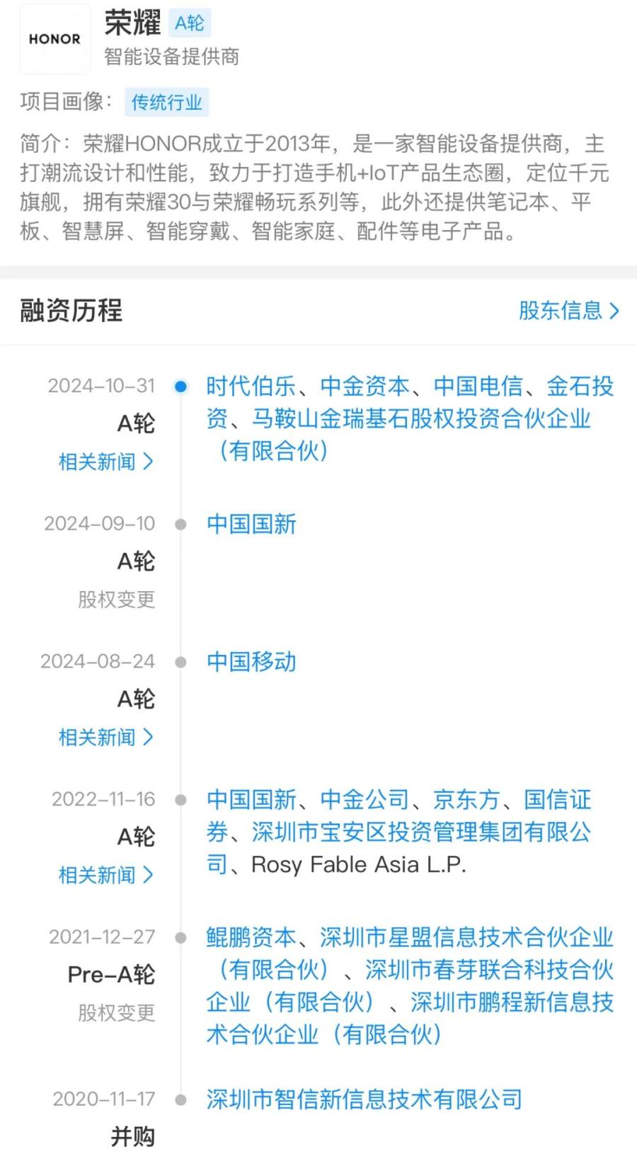 2023年末,荣耀宣布将通过首发上市的方式进入资本市场。次年,据企查查显示,荣耀先后在8月、9月、10月完成了三次融资。