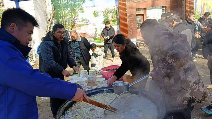 团拜会后大家在一起吃大锅饭,鹿邑海娃烩面宋林远闭店,自费部分食材,早早赶到兰洼村做羊肉汤,煮毛鸡蛋。现场二百余人共进午餐,其乐融融。兰军一家为大家提借了酒水,大力支持家乡的建设。