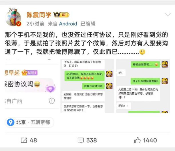 而发布后,陈震也发觉不妥,在删除微博后发文表示,“那个手机不是我的,也没签过任何协议,只是刚好看到觉得很薄,于是就拍了张照片发了个微博,然后对方有人跟我沟通了一下,我就把微博隐藏了,仅此而已。”