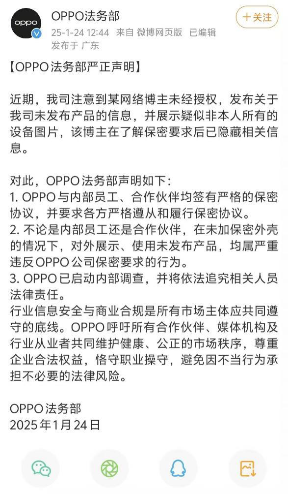 对此,OPPO法务部快速回应称,公司与内部员工、合作伙伴均签有严格的保密协议,要求各方严格遵守;未经授权发布未上市产品信息的行为严重违反了公司的保密要求;公司已启动内部调查,并将依法追究相关人员的法律责任。