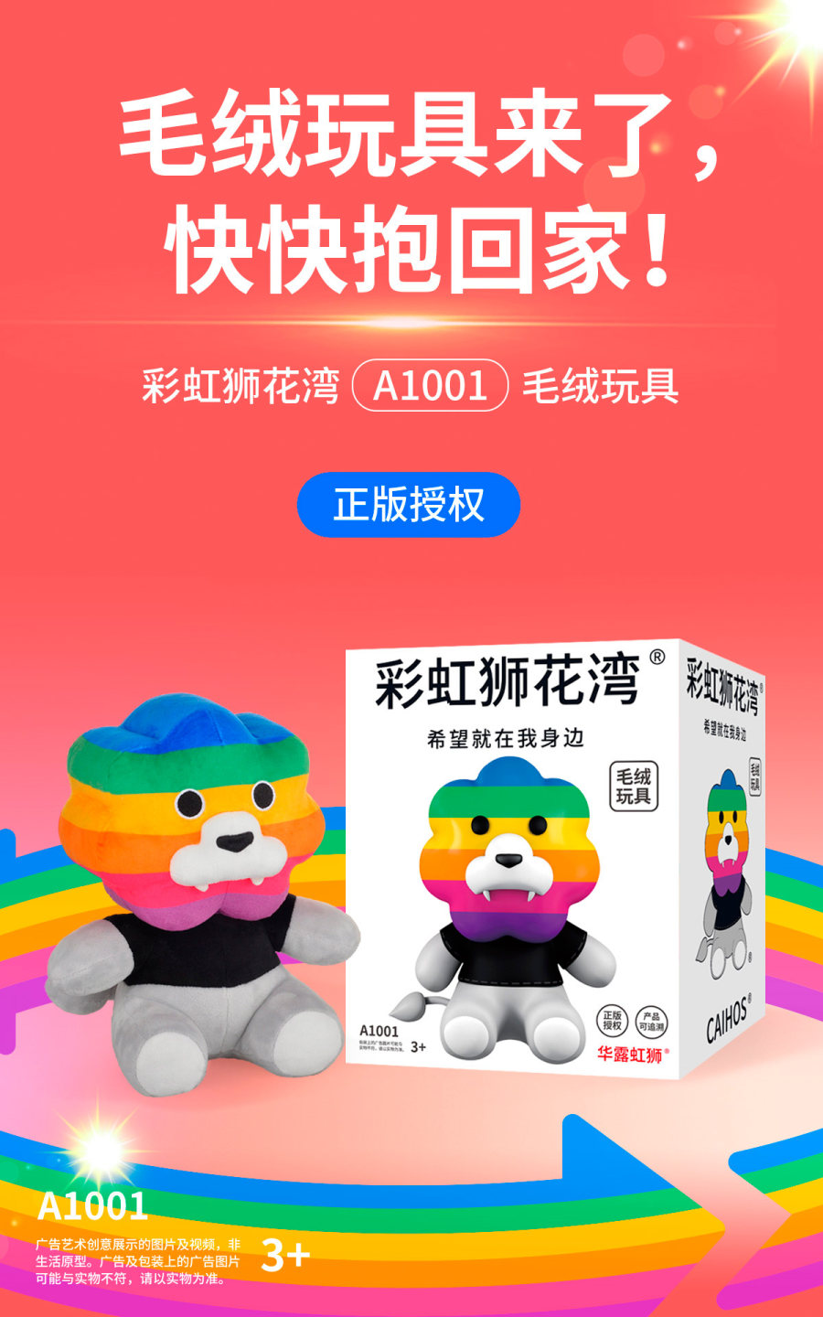 「彩虹狮花湾」毛绒玩具(型号:A1001),是选取了卡通角色「彩虹狮」的笔名——「彩虹狮花湾」,以「彩虹狮花湾」这个笔名作为全新品牌而延展的毛绒玩具。在外形设计上,通过巧妙的彩虹条纹,环绕在「彩虹狮花湾」毛绒玩具整个头部的立体设计,强化了主视觉的识别。