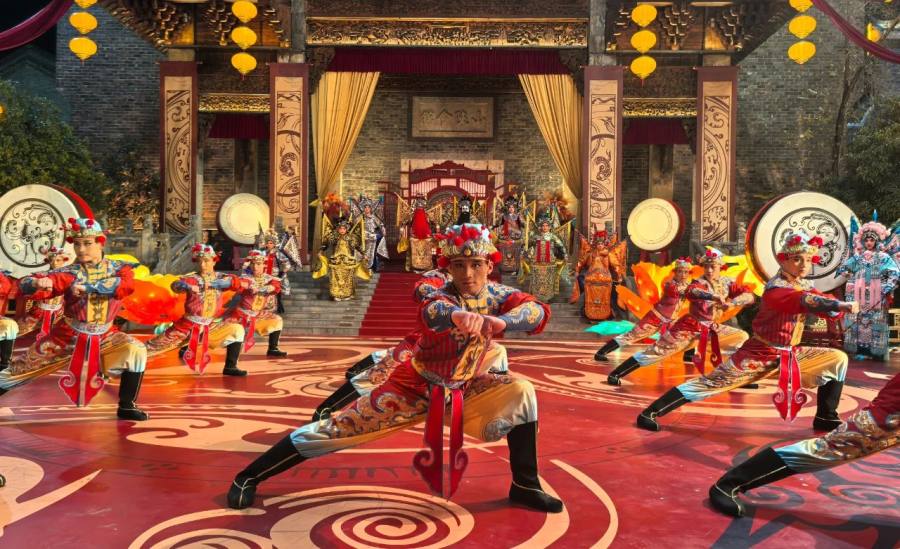 《开场呼号》中,塔沟武校300名功夫小子身着盛装、手拍腰鼓,跟随音乐节拍,不断腾挪跳跃,与声光打造的现代科技效果,共同营造节奏感强、视觉明快、欢快喜庆的开场氛围。