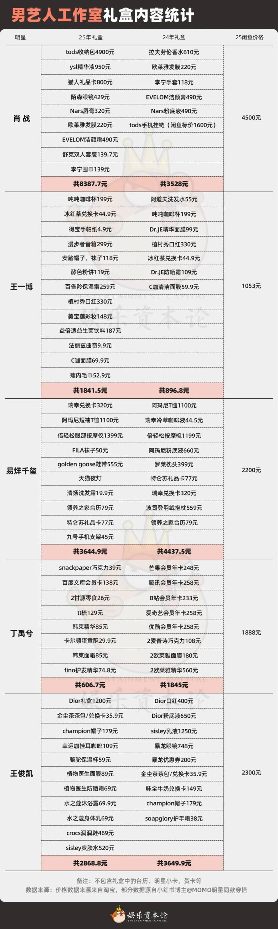 每逢新年,明星工作室送出的礼盒总能引发一波热议。礼盒的豪华程度,似乎成了衡量明星咖位和商业价值的隐形标尺。今年,顶流们的礼盒依旧“神仙打架”,但与去年相比,有的礼盒价值水涨船高,有的却略显“缩水”,可谓是几家欢喜几家愁。