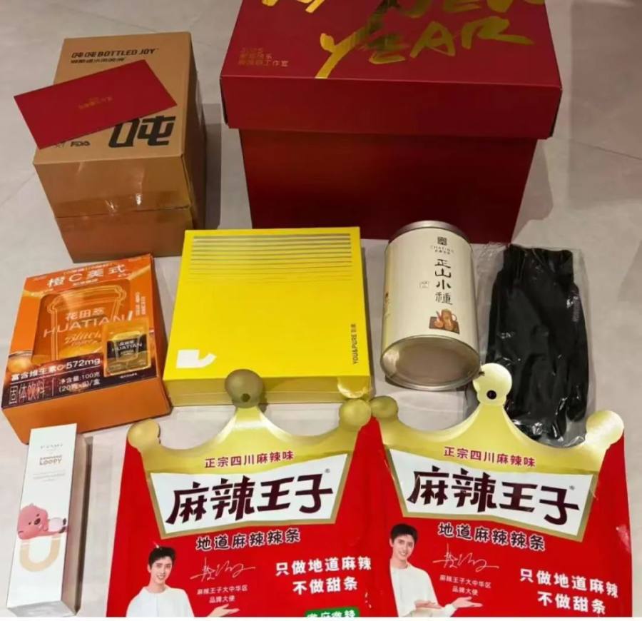 而张晚意、沈月、林一、敖瑞鹏等演员的礼盒,走起了“亲民路线”。张晚意选择上森派系袜子(39.9元)、哈吉斯帽子(359元)、玫瑰乐高(129元)等单品,总价值约500+元;沈月则别出心裁,送出ERNTE三明治机(319元)、PGG智能拔罐仪(358元)、奈娃九阳净水器(129元)等生活好物,总价值约800+元;林一工作室的礼盒充满了生活气息,老虎颈枕、盐津铺子零食、霸王茶姬毛绒杯(239元)、熏风上衣(79元)、offrelax洗发露(169元)、雅萌面膜(198元)等单品,总价值约700+元。敖瑞鹏礼盒中包含吨吨桶(199元)、花田萃橙C美式(39.7元)、柏瑞美定妆喷雾(44.9元)、麻辣王子辣条两袋(39.6元)、361度手套(40.9元)、羽素清肌焕肤小美盒(闲鱼65元-145元)、正山小种茶叶等,总价值约500元上下。