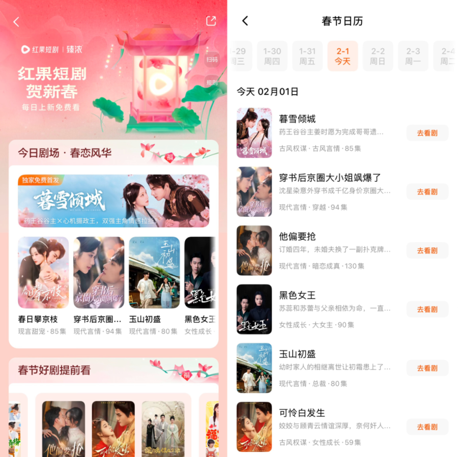 其中,行业黑马红果短剧这个春节档预计上线超百部精品短剧,在腊月二十三小年夜至正月初七陆续免费播出,用户平均每天可以解锁8部不同题材的作品,既可以降低选择成本、也能满足不同内容偏好的用户。