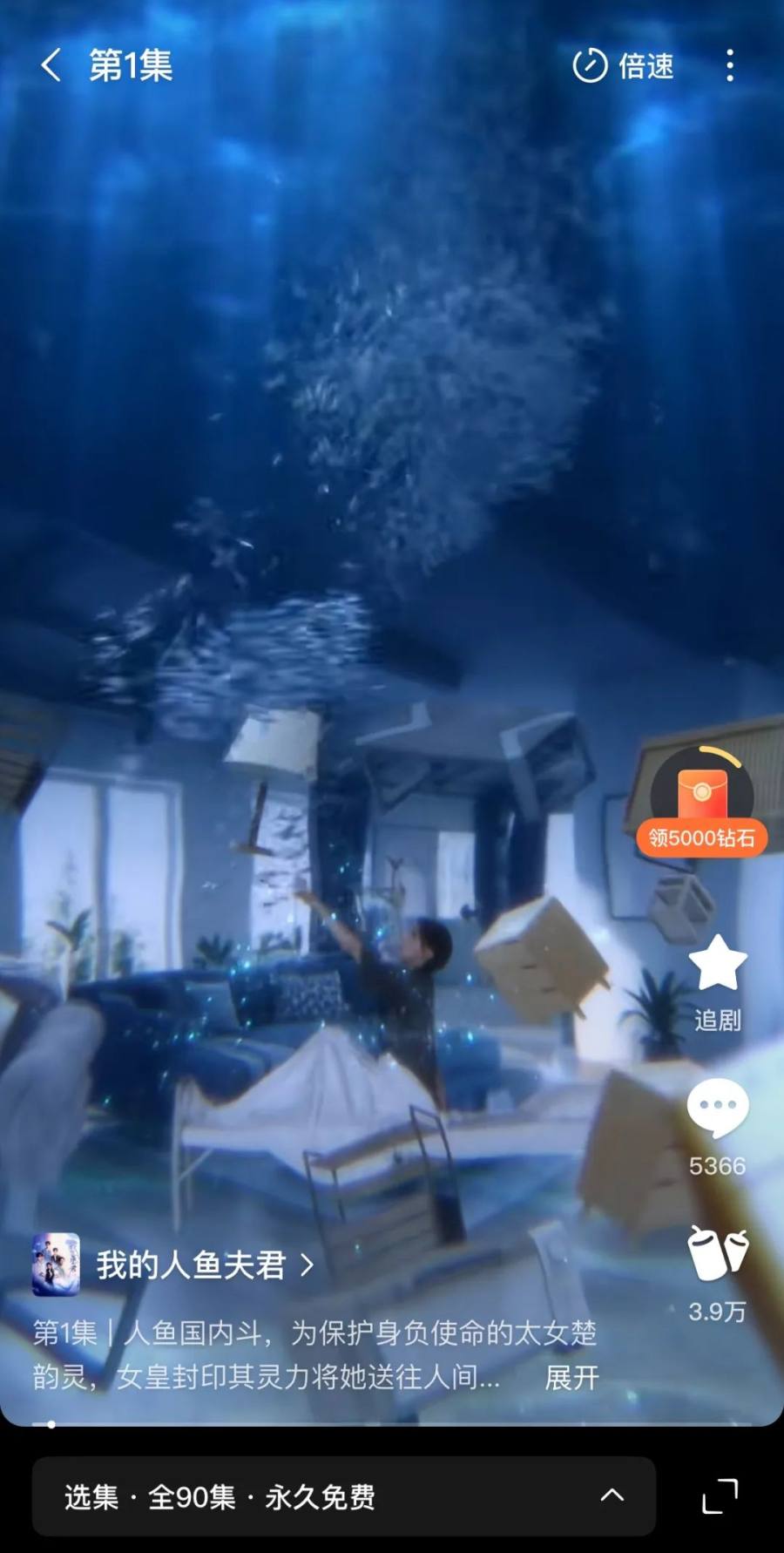 今年在红果短剧上线的诸多仙侠题材作品,特效都非常在线。改编自番茄小说的《小师妹天生反骨》,就有大量营造修仙氛围、法力变换的特效。《我的人鱼夫君》第一集开场以宏大的奇幻场景将观众拽入梦境,紧接着绚烂的蓝色空间丝滑切换至蔚蓝的大海,两位矫健的人鱼嬉闹其中。