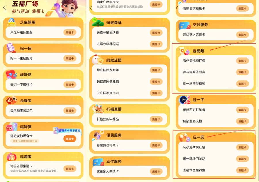 筛选一波后,其实已经可以说今年集福卡任务的增量就是看视频、碰一下和玩一玩三个模块。