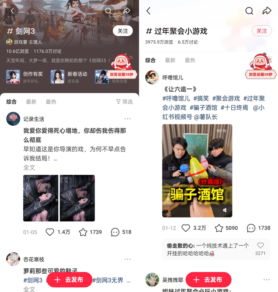 这样的形态可以说是帖子形态的再升级,而此次新春活动也是最好的曝光点,如果大家适应并转化了一部分用户向话题形态,那么之后再做一些活动要简单太多了,能将同一兴趣的人短暂地聚合在了一起,但在热度过去之后大家也会各自散开寻找下一个关注的话题,既保证了流量的统一,也不用担心出现像百度贴吧那样山头林立的情况。